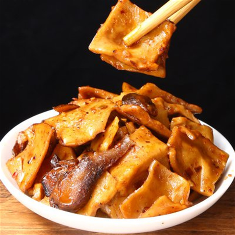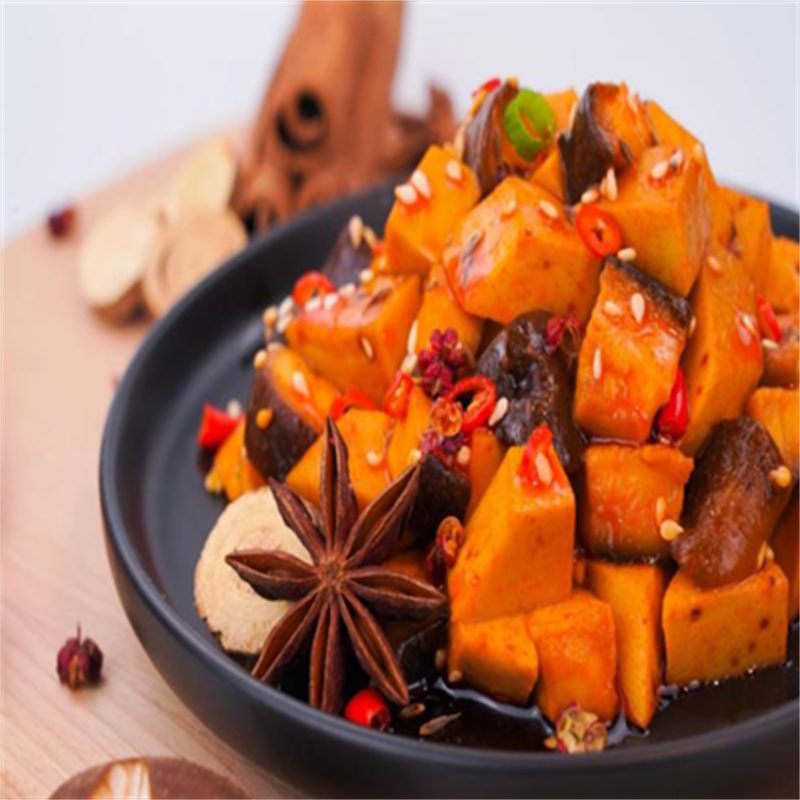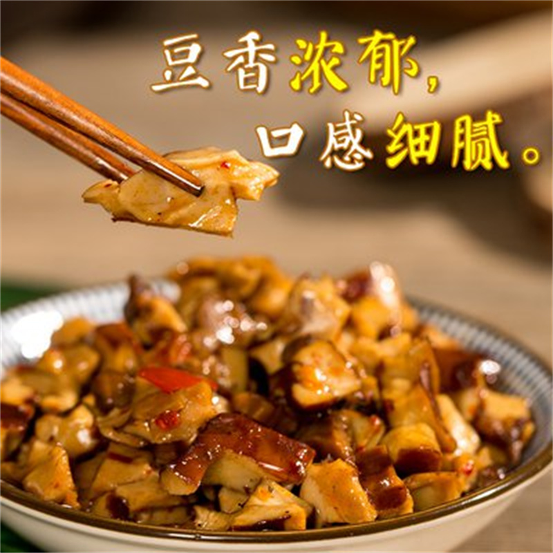 The series of products of shiitake bean curd mainly uses soybean isolate protein powder and shiitake as raw materials to be processed into the combination of the two makes this product have both the mellow fragrance of bean curd and the mushroom fragrance of shiitake, with a strong fragrance and more comprehensive nutrition and then it is refined by several processes, the product appearance is reddish brown, delicious, good in toughness, chewy, Q elastic and tender